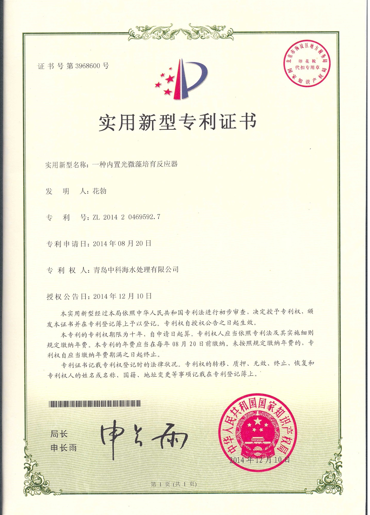 中科海专利证书
