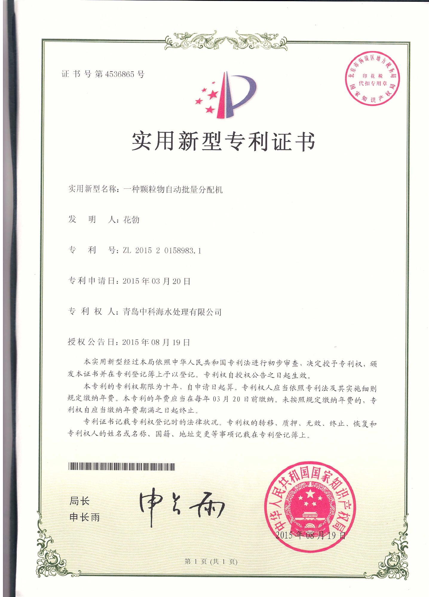 中科海专利证书