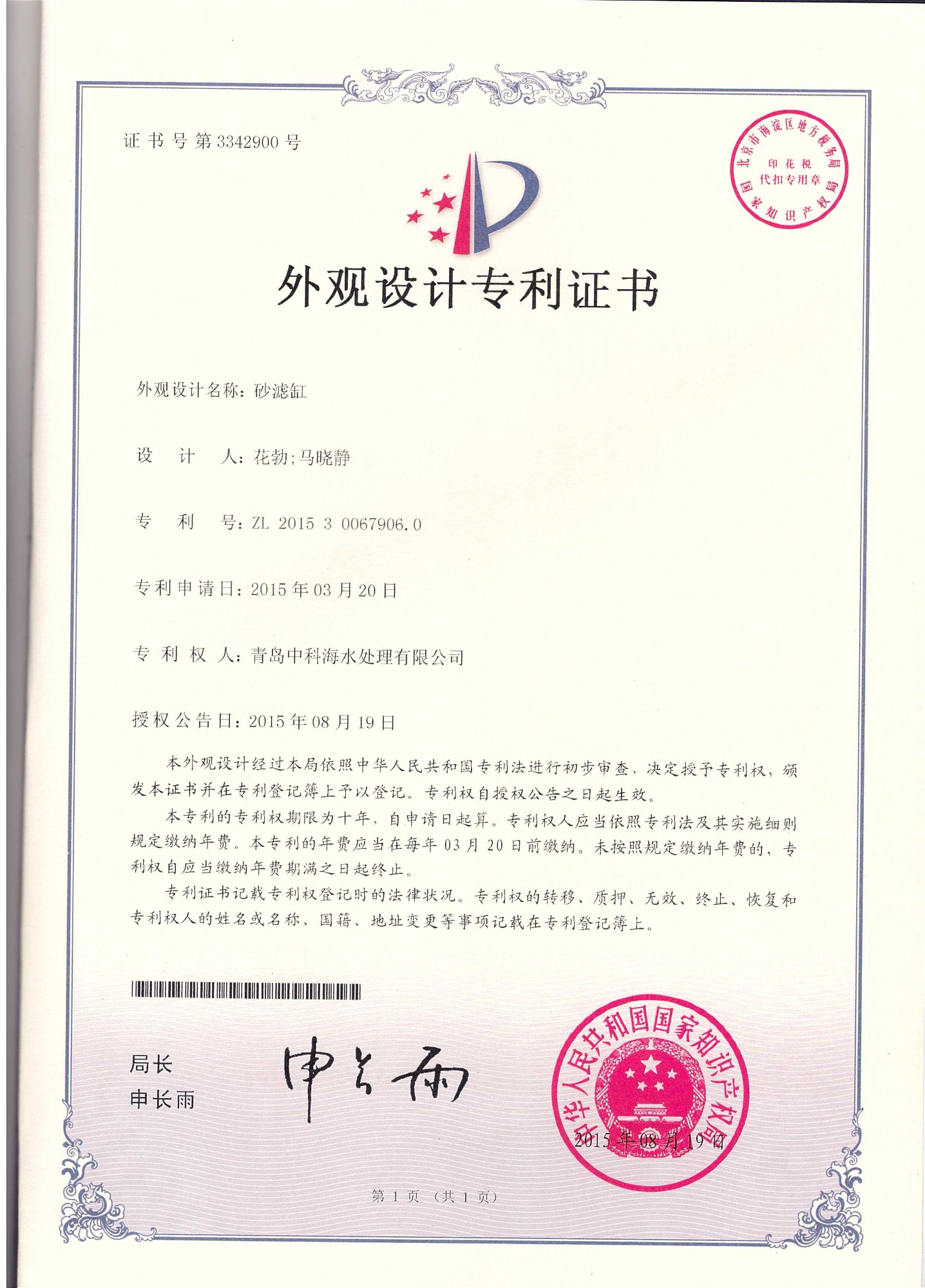 中科海专利 高速砂滤缸 外观设计