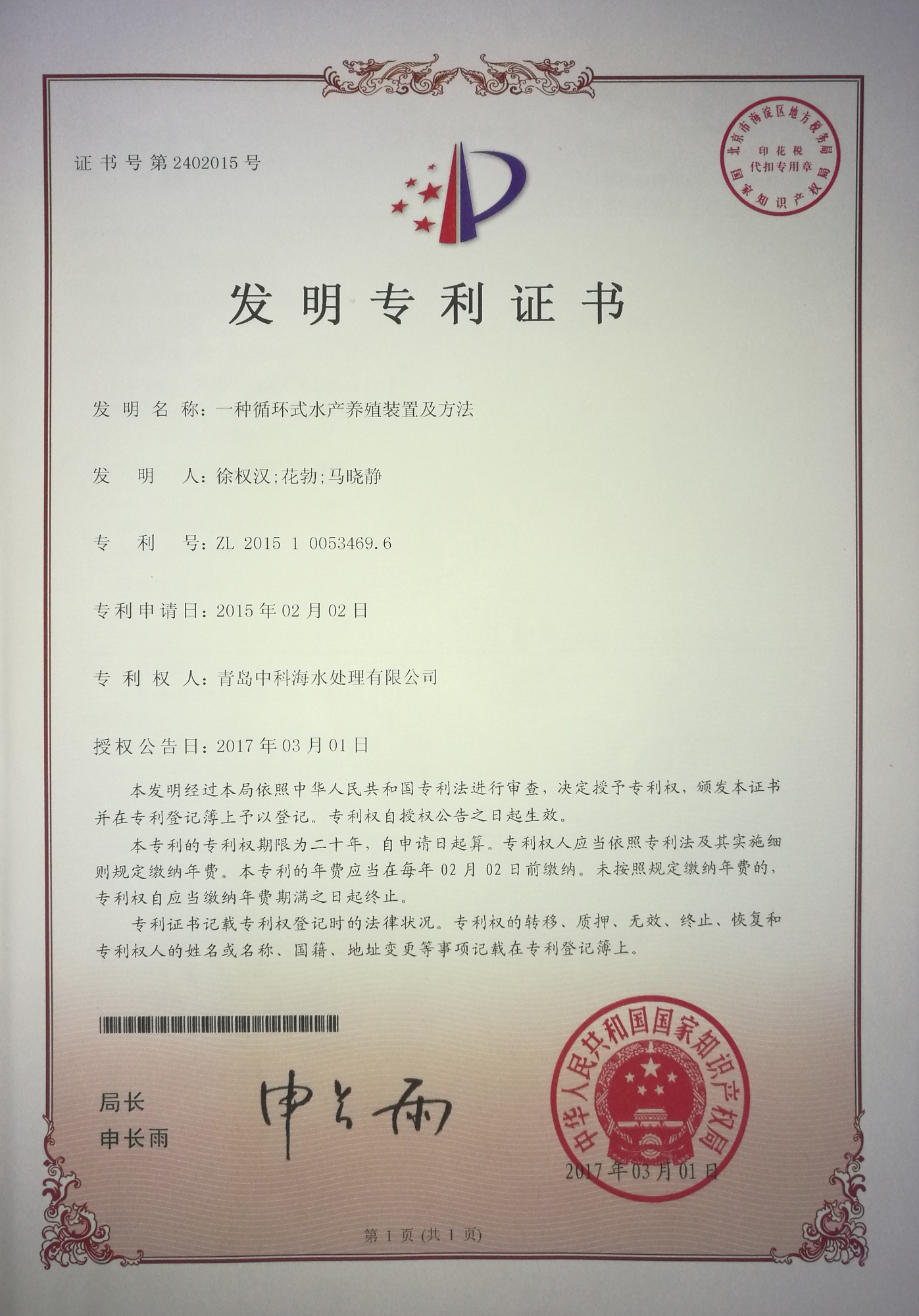 中科海专利证书