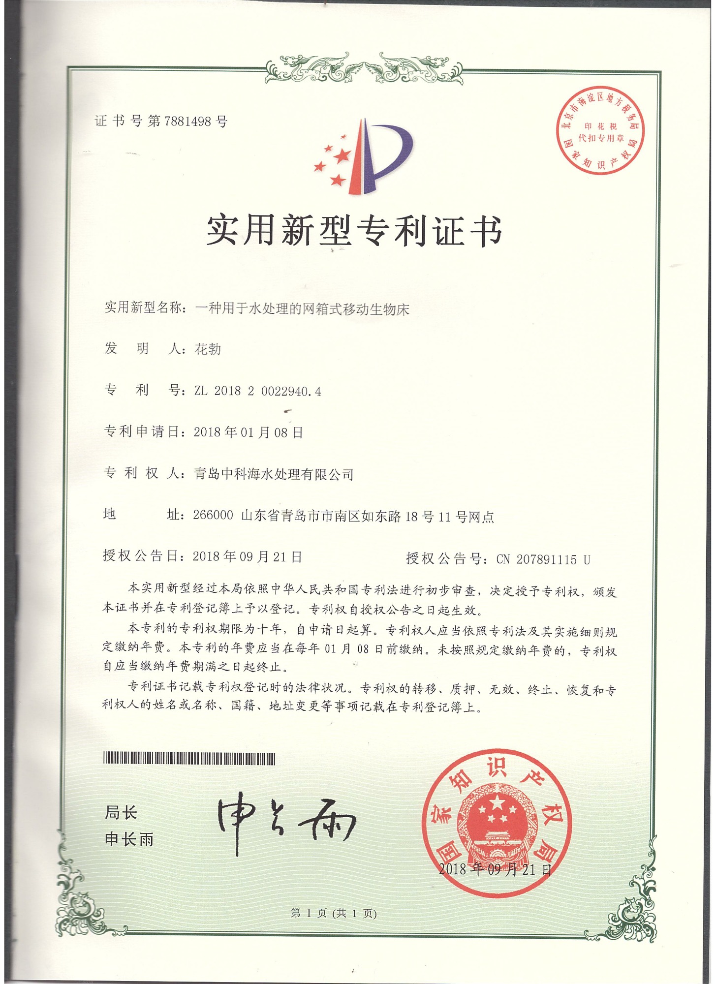 中科海专利证书