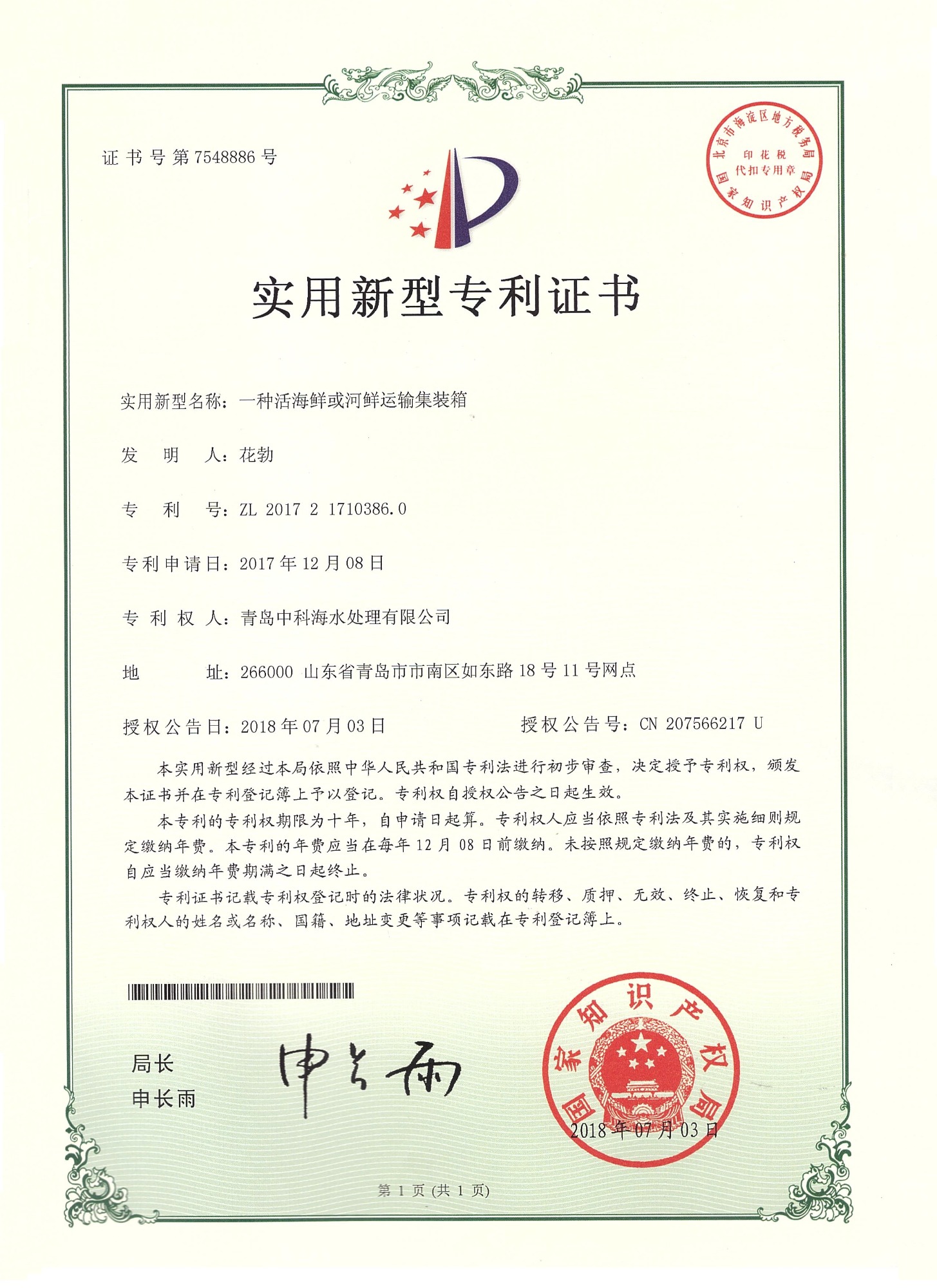中科海专利证书