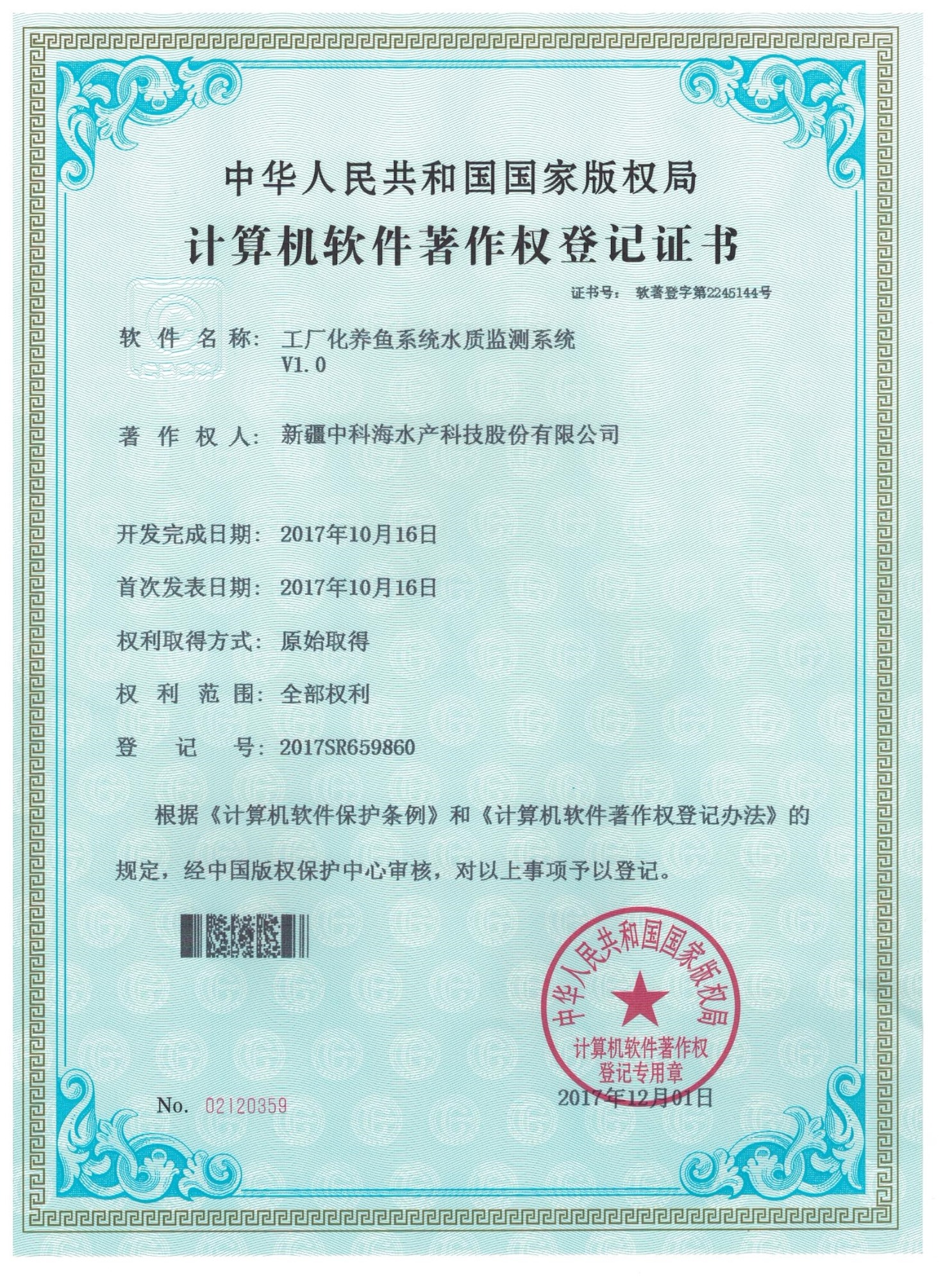 中科海软件著作 工厂化养鱼系统水质监测系统
