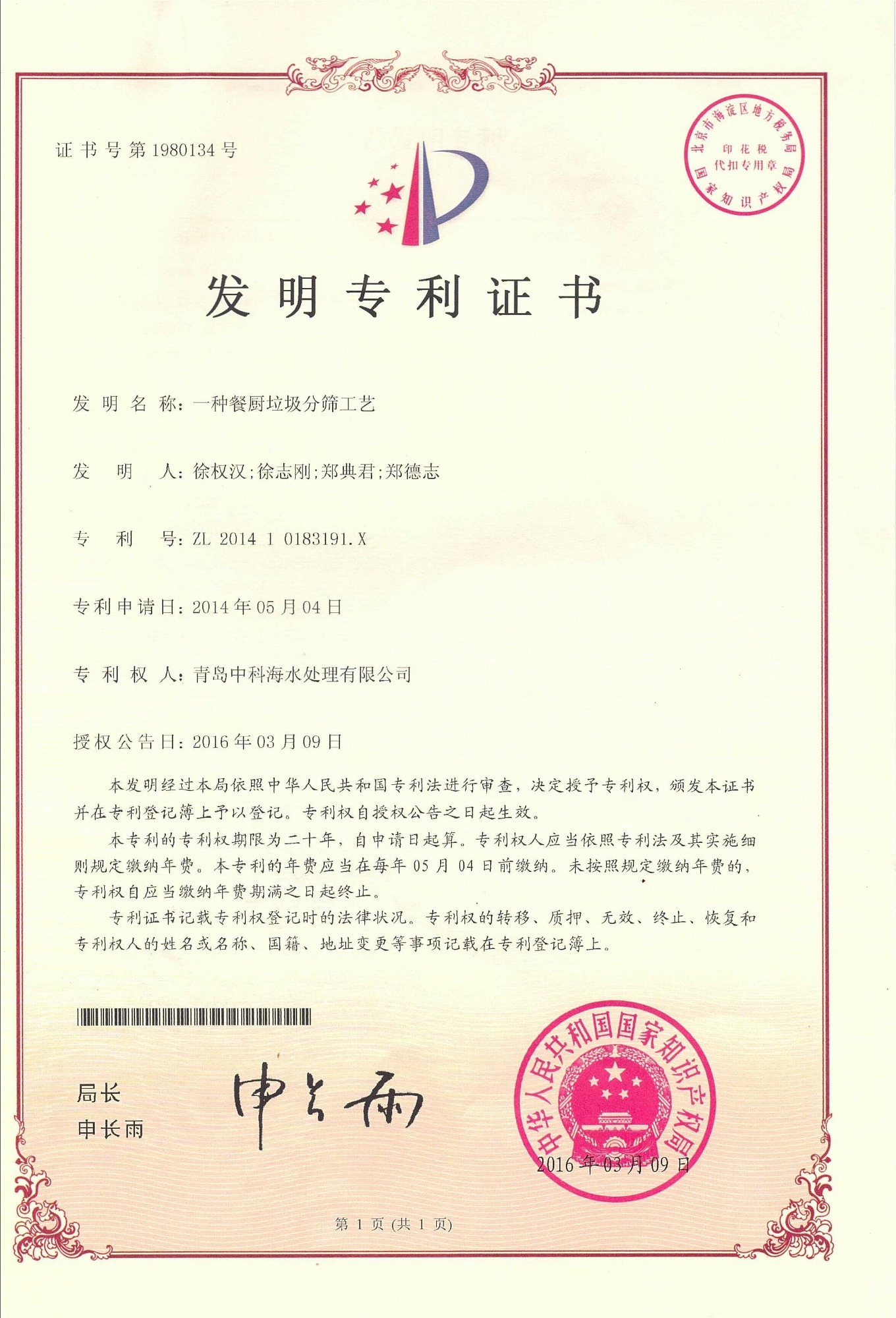 中科海专利证书