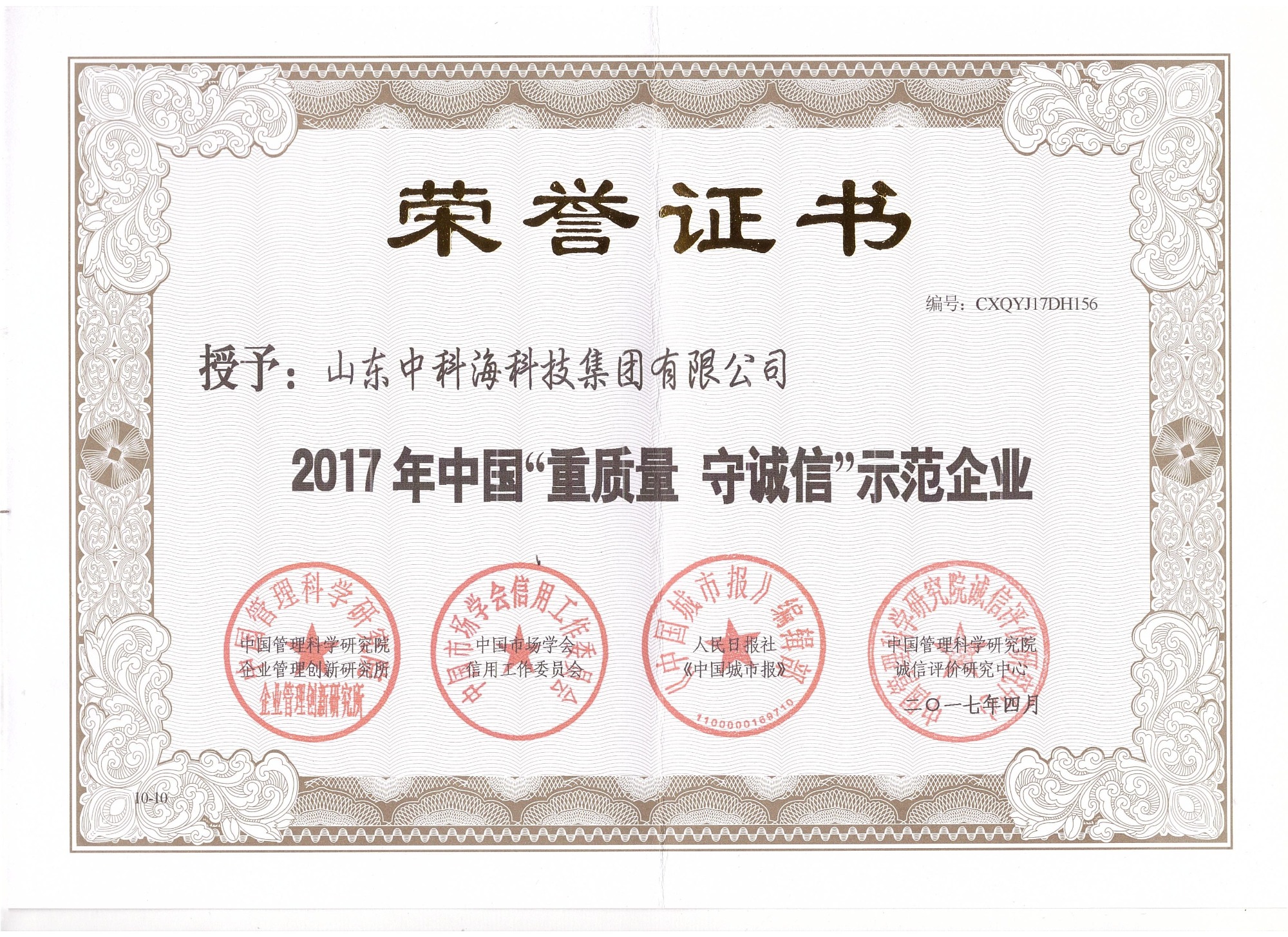 2017年中国“重质量、守诚信”示范企业 荣誉证书